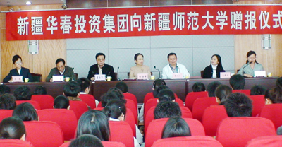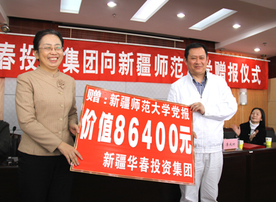 在陽春3月的25日下午,新疆華春投資集團向新疆師范大學(xué)的贈報儀式在新疆師大教學(xué)主樓學(xué)術(shù)報告廳隆重舉行。華春投資集團首期出資現(xiàn)金將近9萬元,訂購全年度的黨報《新疆經(jīng)濟報》300份,贈送給新疆師范大學(xué)的教師們,方便教師們及時學(xué)習(xí)了解黨的路線、方針、政策及國內(nèi)外各項重大信息。新疆華春投資集團為推進新疆教學(xué)人才的培育、為新疆和諧社會的構(gòu)建,從而奉獻出新疆華春投資集團的一份愛心。