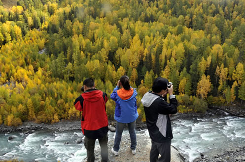 9月15日,幾位攝影師在喀納斯景區(qū)拍照。