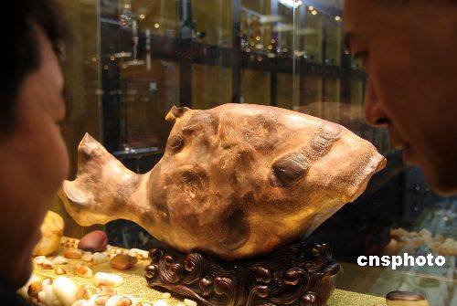 近日,北京愛家國(guó)際收藏品交流市場(chǎng)的一商戶,展出一款來自新疆天山南部一干枯的湖底中發(fā)現(xiàn)的形似“魚”的罕見天然五彩奇石,形象逼真、色彩斑瀾,長(zhǎng)72.8cm、高33cm,重達(dá)20多公斤。此石被專家們譽(yù)為天下第一奇石,其價(jià)值約億元人民幣。展出3天以來,吸引了不少中外收藏愛好者。
