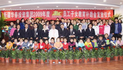 11月1日,華春投資集團(tuán)員工的近百名子女歡天喜地的迎來了一個(gè)在首府乃至在全疆絕無僅有的特殊節(jié)日——華春投資集團(tuán)舉辦2009年首批員工子女教育補(bǔ)助金的啟動(dòng)儀式,當(dāng)天就有84個(gè)員工家庭的子女領(lǐng)到了近十萬元教育補(bǔ)助金,其中有一個(gè)員工家庭的3個(gè)子女同時(shí)獲得教育補(bǔ)助金,另一個(gè)員工家庭的兩個(gè)子女獲得了7000元。