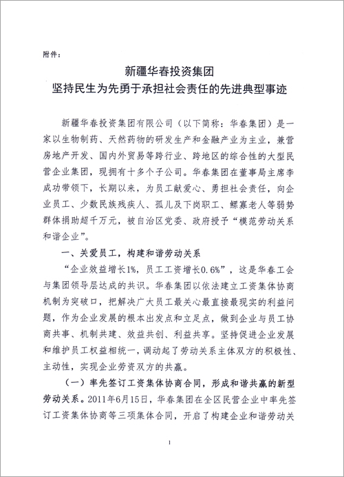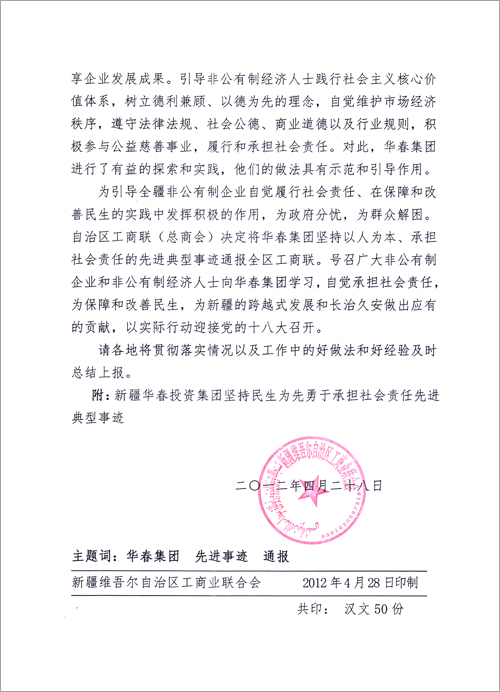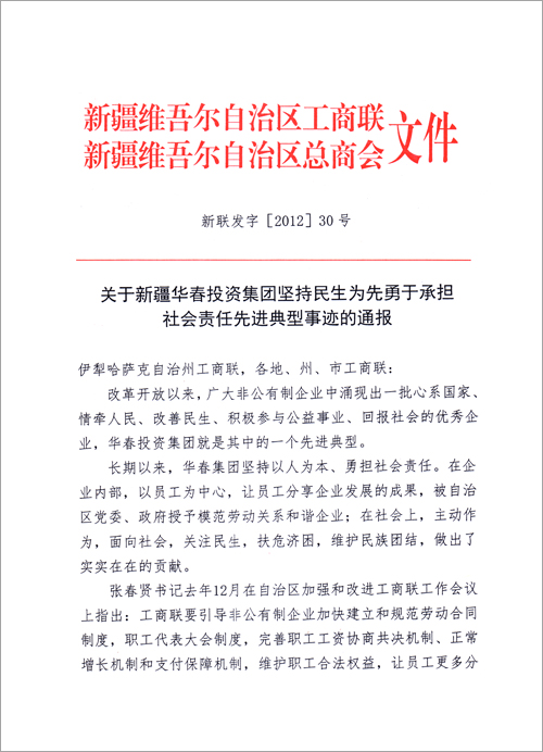 為引導(dǎo)全疆非公有制企業(yè)自覺履行社會責(zé)任,在保障和改善民生的實(shí)踐中發(fā)揮積極的作用,為政府分憂,為群眾解困。自治區(qū)工商聯(lián)(總商會)決定將華春投資集團(tuán)堅(jiān)持民生為先勇于承擔(dān)社會責(zé)任先進(jìn)典型事跡通報(bào)全區(qū)工商聯(lián)。號召廣大非公有制企業(yè)和非公有制經(jīng)濟(jì)人士向華春投資集團(tuán)學(xué)習(xí),自覺承擔(dān)社會責(zé)任,為保障和改善民生,為新疆的跨越式發(fā)展和長治久安做出應(yīng)有的貢獻(xiàn),以實(shí)際行動迎接黨的十八大召開。