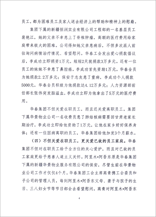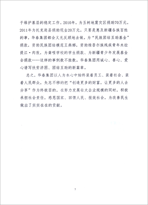 華春投資集團(tuán)成立17年來,作為一個(gè)有社會責(zé)任感的民營企業(yè),華春投資集團(tuán)履行責(zé)任,積極參與公益事業(yè),反哺社會,感恩各界,是新疆首家參與社會主義新農(nóng)村建設(shè)的民企;是全疆向社會各界贈送價(jià)值高達(dá)幾十萬元的黨報(bào)、提供精神食糧的企業(yè);是全國首家資助第八屆全國民運(yùn)會新疆代表團(tuán)的民企;華春投資集團(tuán)是全疆對員工從獎勵住房到組織旅游、從子女上學(xué)到父母養(yǎng)老等40多項(xiàng)福利形成制度化的民營企業(yè)……