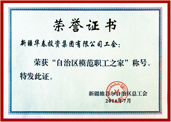 華春集團(tuán)工會(huì)的典型事跡被定為培訓(xùn)全國(guó)工會(huì)干部的教材,獲得諸多榮譽(yù),被烏魯木齊市總工會(huì)授予“模范職工之家”、被新疆自治區(qū)總工會(huì)、人力資源和社會(huì)保障廳等授予“自治區(qū)模范勞動(dòng)關(guān)系和諧企業(yè)”、被全國(guó)總工會(huì)、全國(guó)工商聯(lián)、人力資源社會(huì)保障部授予“全國(guó)就業(yè)與社會(huì)保障先進(jìn)民營(yíng)企業(yè)”、被全國(guó)總工會(huì)、發(fā)展改革委、科技部授予全國(guó)“講理想、比貢獻(xiàn)”先進(jìn)集體等榮譽(yù)稱號(hào)。