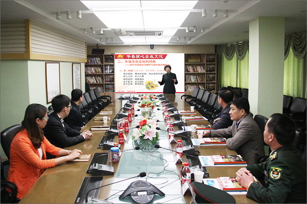 王獻斌大校一行首先參觀了華春集團文化中心,集團副總裁高青就華春企業(yè)文化的核心理念、主要產業(yè)、重大科研成果、發(fā)展戰(zhàn)略及前景、企業(yè)榮譽、社會責任等進行了介紹。在座談會上,高青重點闡述了華春企業(yè)文化的打造原則、以中華民族文化精華與現代意識相結合企業(yè)文化特質的核心價值觀、企業(yè)文化主題理念、企業(yè)經營理念及標志釋義等。雙方就如何深刻學習掌握國學傳統(tǒng)文化精華、在當代社會增強各族人民對祖國的認同、對中華文化的認同、踐行社會主義核心價值觀的重要性等,進行了熱烈的討論交流。集團總助王錫輝與企業(yè)文化中心主任藍泰彬、陳旭虎、華春小貸工會主席趙瑜等管理人員參加了座談。