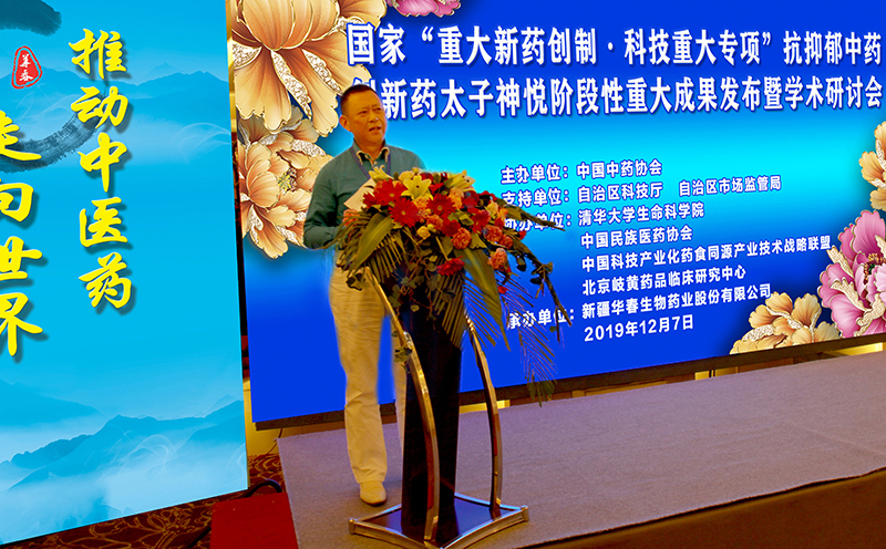 新疆自治區(qū)衛(wèi)生健康委黨組成員、副主任周美林在講話中說(shuō):自治區(qū)黨委、政府也高度重視中醫(yī)藥工作,陳全國(guó)書(shū)記對(duì)貫徹落實(shí)《中共中央 國(guó)務(wù)院關(guān)于促進(jìn)中醫(yī)藥傳承創(chuàng)新發(fā)展的意見(jiàn)》和全國(guó)中醫(yī)藥大會(huì)精神作出了重要指示,進(jìn)行了安排部署,我委按照自治區(qū)黨委政府要求也在為召開(kāi)自治區(qū)中醫(yī)藥大會(huì)進(jìn)行積極籌備。通過(guò)多年艱辛努力,由清華大學(xué)、新疆華春生物藥業(yè)股份有限公司共同研發(fā)的抗抑郁中藥創(chuàng)新藥“太子神悅膠囊”,是自治區(qū)獲得“十三五”國(guó)家重大新藥創(chuàng)制科技重大專(zhuān)項(xiàng)的中藥創(chuàng)新成果,其取得的階段性重大成果、擁有的自主知識(shí)產(chǎn)權(quán),必將對(duì)推動(dòng)自治區(qū)中醫(yī)藥科技創(chuàng)新和現(xiàn)代化發(fā)產(chǎn)生重大意義。本次科技成果發(fā)布會(huì),將是對(duì)我們新疆本土藥企中醫(yī)藥自主創(chuàng)新能力和科研實(shí)力的一次全面展示;同時(shí)通過(guò)學(xué)術(shù)研討,也為來(lái)自國(guó)內(nèi)中醫(yī)藥專(zhuān)家學(xué)者針對(duì)精神性疾病領(lǐng)域的中醫(yī)藥科研成果進(jìn)行深入交流提供了難得的交流機(jī)會(huì)和平臺(tái),將對(duì)促進(jìn)我區(qū)精神性疾病中醫(yī)藥診療、新藥研發(fā)進(jìn)步發(fā)揮重要的作用。