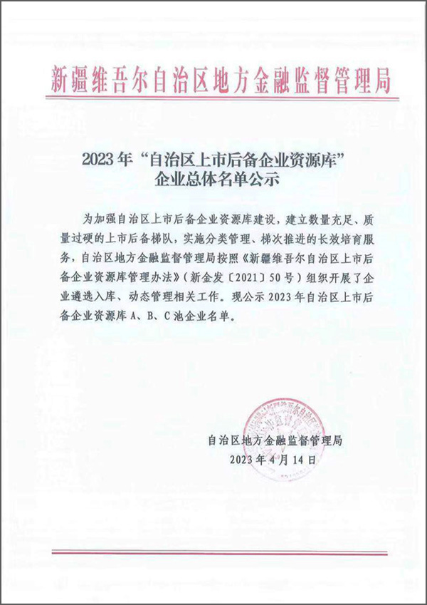 列入“自治區(qū)上市后備企業(yè)資源庫(kù)”的企業(yè),是自治區(qū)政府為加強(qiáng)自治區(qū)上市后備企業(yè)資源庫(kù)建設(shè)而建立的數(shù)量充足、質(zhì)量過硬的上市后備梯隊(duì)。自治區(qū)企業(yè)上市推進(jìn)工作領(lǐng)導(dǎo)小組辦公室按照《新疆維吾爾自治區(qū)上市后備企業(yè)資源庫(kù)管理辦法》進(jìn)行企業(yè)遴選入庫(kù)、動(dòng)態(tài)管理,對(duì)入選的企業(yè)實(shí)施分類管理、梯次推進(jìn)的長(zhǎng)效培育服務(wù),旨在深入發(fā)掘擬上市企業(yè)資源,優(yōu)化資源配置,加強(qiáng)多層次資本市場(chǎng)建設(shè),促進(jìn)自治區(qū)企業(yè)在多層次資本市場(chǎng)上市、掛牌和融資。