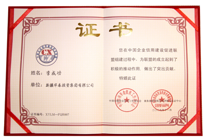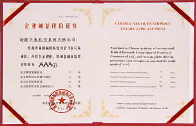 華春投資集團(tuán)被評(píng)為最高信用等級(jí)即AAA①級(jí)的誠(chéng)信企業(yè),頒發(fā)了信用等級(jí)證書(shū),并出具了信用等級(jí)評(píng)估報(bào)告。同時(shí),華春投資集團(tuán)被商務(wù)部研究院信用評(píng)級(jí)與認(rèn)證中心定為中國(guó)企業(yè)信用建設(shè)促進(jìn)聯(lián)盟發(fā)起單位,總裁李成功先生被定為中國(guó)企業(yè)信用建設(shè)促進(jìn)聯(lián)盟發(fā)起個(gè)人。