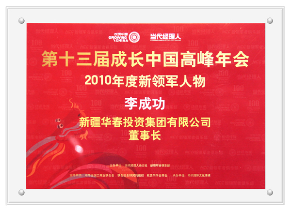由《當代經(jīng)理人》雜志社和新領(lǐng)軍者俱樂部主辦、全國工商聯(lián)、歐美同學會商會、聯(lián)合國全球契約組織等聯(lián)合協(xié)辦的第十三屆成長中國高峰年會暨2010中國成長百強頒獎盛典,于12月4日~5日在北京隆重舉行,新疆華春投資集團入選“2010中國成長百強”前25名、董事長兼總裁李成功先生榮獲“2010年度新領(lǐng)軍人物”稱號。