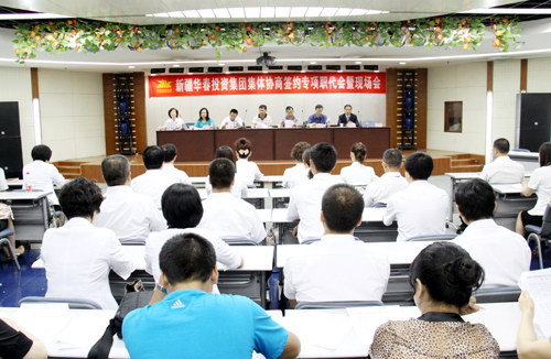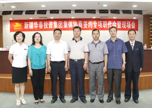 6月15日上午,對于新疆華春投資集團全員來說,是個神圣的日子,在我們偉大的中國共產黨成立90周年的前夕,在全社會著力構建和諧、改善民生的關鍵時刻,作為高新區(qū)(新市區(qū))簽訂三項集體合同的重點示范企業(yè)新疆華春投資集團集體協(xié)商簽約專項職代會暨現(xiàn)場會,在高新區(qū)管委會5樓多功能廳隆重舉行!自治區(qū)總工會、烏魯木齊市總工會和高新區(qū)(新市區(qū))區(qū)委領導出席會議,高新區(qū)(新市區(qū))轄區(qū)內各主要企業(yè)派代表前來觀摩,共同見證了受華春投資集團法定代表人委托的企業(yè)方代表周躍江先生和職工方的代表華春投資集團工會主席高青同志,簽訂“三項合同”即《集體合同》、《工資集體協(xié)議合同》和《女職工權益保護專項集體合同》。