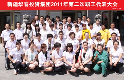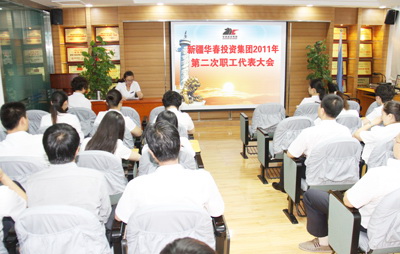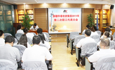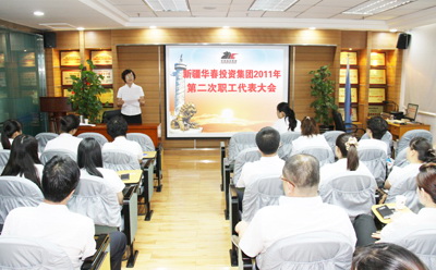新疆華春投資集團有限公司2011年第二次職工代表大會于7月30日上午在新疆華春投資集團子公司新疆恒潤實業(yè)有限公司培訓(xùn)室召開,會議由高青同志主持。參加會議的應(yīng)到職工代表51人,實到職工代表 49人。