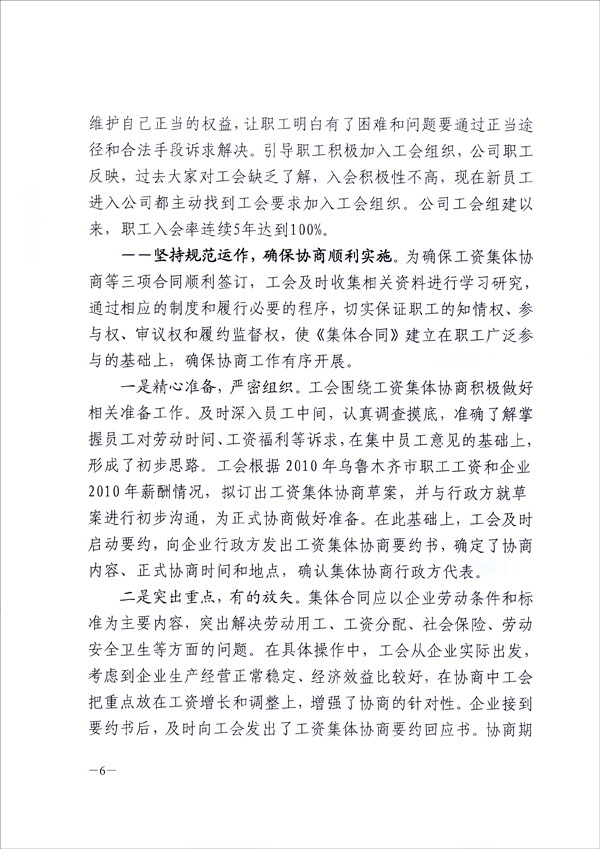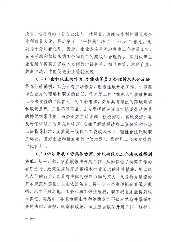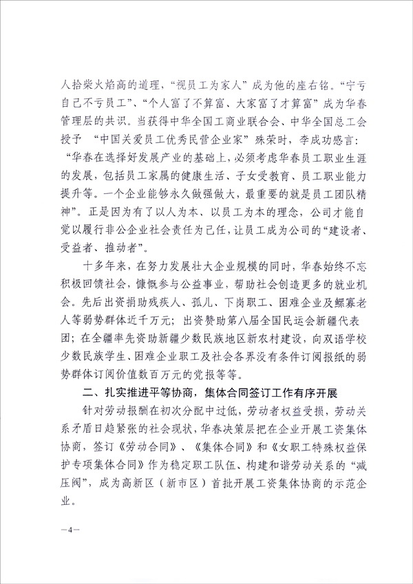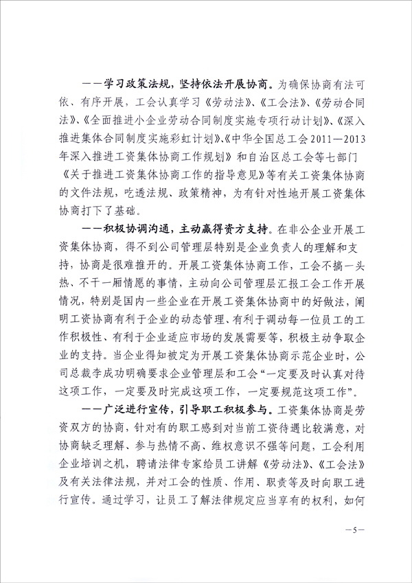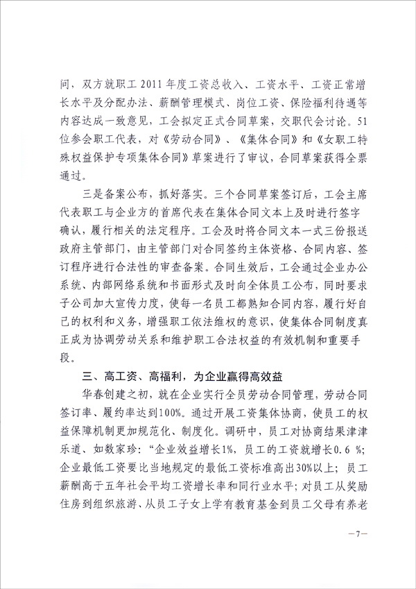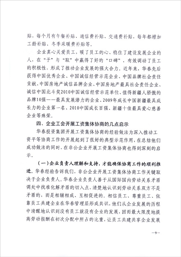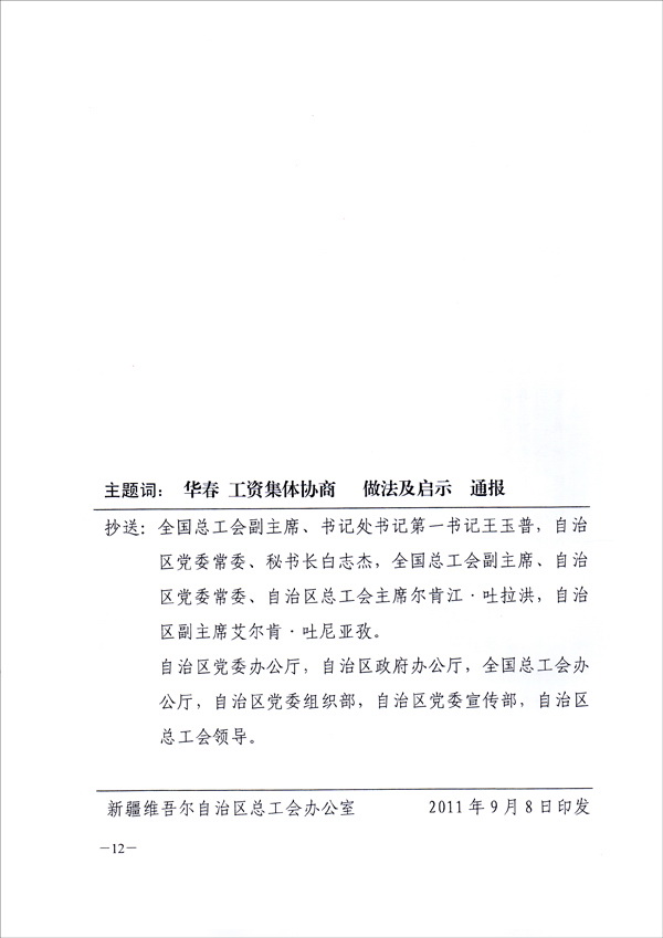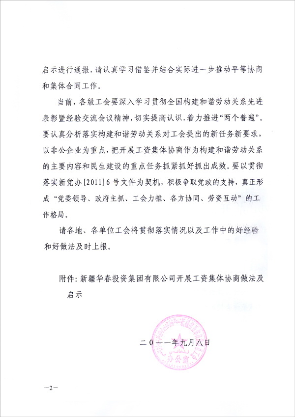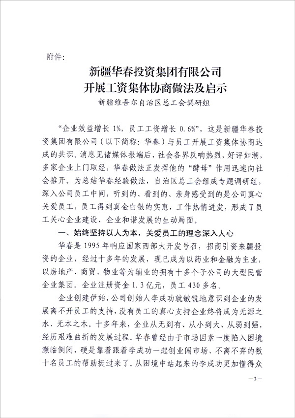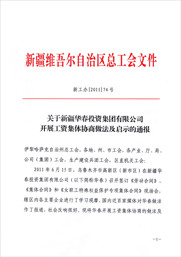 為在全疆推進工資集體協(xié)商、構建和諧勞動關系,新疆維吾爾自治區(qū)總工會于9月8日向全疆各地州、各產(chǎn)業(yè)、廳、局、公司集團、生產(chǎn)建設兵團、區(qū)直屬機關工會,正式下發(fā)了長達十幾頁的“關于新疆華春投資集團有限公司開展工資集體協(xié)商做法及啟示的通報”的紅頭文件,要求全疆認真學習與借鑒。
