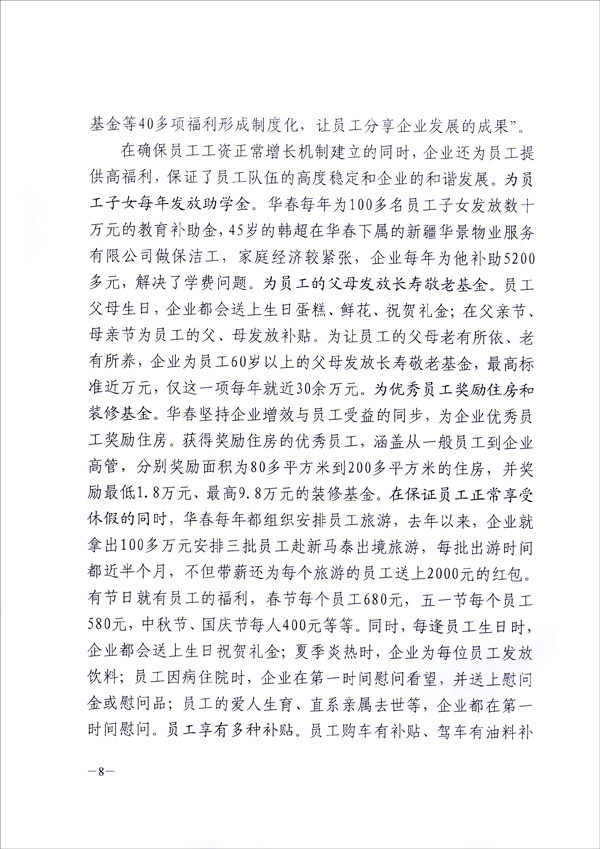 由新疆維吾爾自治區(qū)總工會調(diào)研組撰寫的《新疆華春投資集團有限公司開展工資集體協(xié)商做法及啟示》,對新疆華春投資集團和華春工會給予了高度評價,認為新疆華春投資集團的做法與經(jīng)驗,為推動新疆工資集體協(xié)商工作的開展,起到了很好的典型示范作用。以期通過學習、借鑒華春經(jīng)驗,把開展工資集體協(xié)商作為構建和諧勞動關系的民生建設重點任務抓出成效。