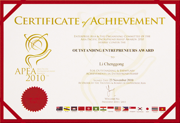 亞太企業(yè)精神獎(jiǎng)(APEA),即對(duì)亞太區(qū)域內(nèi)在建立成功企業(yè)過程中,以堅(jiān)毅精神取得卓越成就、并注重企業(yè)社會(huì)責(zé)任的企業(yè)家們給予的最高獎(jiǎng)項(xiàng)。此項(xiàng)評(píng)選活動(dòng)由亞洲企業(yè)商會(huì)組織主辦,獲得各國(guó)企業(yè)、商會(huì)及政府的支持,在亞洲印度、新加坡、馬來西亞、中國(guó)香港、印度尼西亞、文萊、越南、孟加拉國(guó)、泰國(guó)和中國(guó)等10個(gè)國(guó)家和地區(qū)進(jìn)行評(píng)選,致力于表彰全亞洲企業(yè)家中的精英,激勵(lì)更多創(chuàng)新,承擔(dān)社會(huì)責(zé)任,弘揚(yáng)企業(yè)精神。