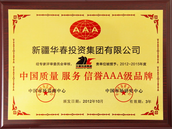 2012年12月,經(jīng)中國市場(chǎng)監(jiān)測(cè)中心、中國市場(chǎng)研究中心對(duì)新疆華春投資集團(tuán)進(jìn)行綜合考證和量化分析,華春投資集團(tuán)榮膺“中國AAA級(jí)重質(zhì)量守信用企業(yè)”、“中國質(zhì)量 服務(wù) 信譽(yù)AAA級(jí)企業(yè)”、“中國質(zhì)量 服務(wù) 信譽(yù)AAA級(jí)品牌”榮譽(yù)稱號(hào),頒發(fā)了榮譽(yù)證書和獎(jiǎng)牌。