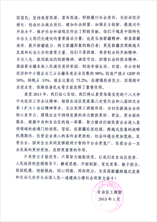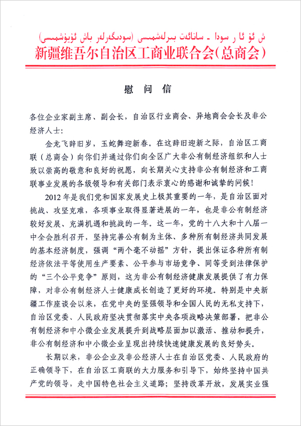 2013年1月17日,自治區(qū)工商聯(lián)黨組成員、自治區(qū)工商聯(lián)副主席努爾力•尤努斯和自治區(qū)工商聯(lián)光彩辦副主任陳風(fēng)玫一行2人,春節(jié)前代表自治區(qū)工商聯(lián)主席及黨組來華春投資集團(tuán)慰問企業(yè)家副會(huì)長李成功總裁并送上自治區(qū)工商聯(lián)黨組的慰問信和鮮花。