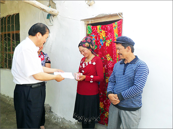 接著,到貧困戶吾布力•馬木提家去慰問。戶吾布力•馬木提大兒子出車禍去世,留下一個小孫子,因妻子患病花費較大而致貧。李湘林副主席把華春資助的2萬元錢送到他妻子的手上,他妻子手捧著錢淚流滿面,她可能一生都沒有一次拿過這么多的錢,對于這樣一個病人,得到的是救命的錢!