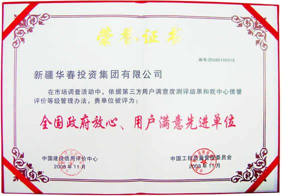 “全國(guó)政府放心、用戶(hù)滿(mǎn)意先進(jìn)單位”榮譽(yù)證書(shū)